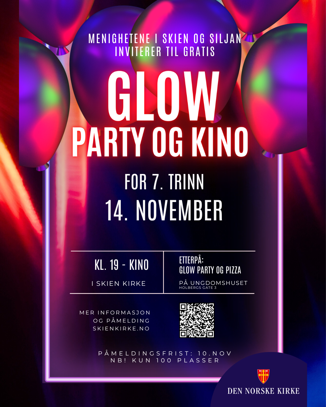 Menighetene i Skien og Siljan inviterer de som er født i 2013 til kino i Skien kirke og Glowparty med pizza på ungdomshuset i Holbergsgate 3, fredag 14. november kl 19.00.